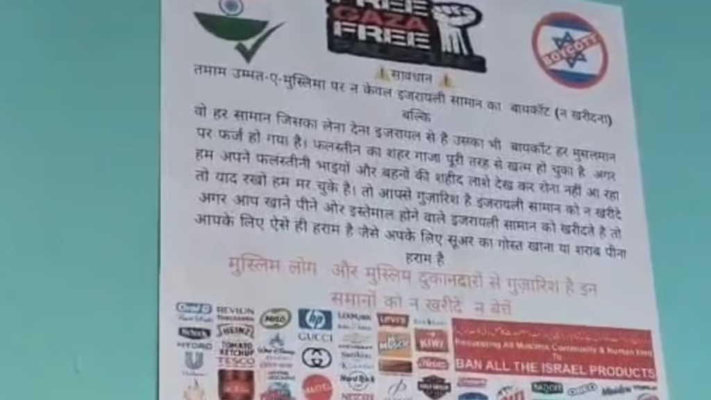 સંભલ (Sambhal) જિલ્લામાં દુકાનો, પોલીસ ચોકીઓ, મદરેસા અને વીજળીના થાંભલા જેવા ઘણા સ્થળોએ ‘ફ્રી ગાઝા, ફ્રી પેલેસ્ટાઇન’ ના નારાવાળા પોસ્ટરો લગાવવામાં આવ્યા છે. આ પોસ્ટરોમાં લખ્યું છે કે “હવે માત્ર ઈઝરાયલી વસ્તુઓનો જ નહીં પરંતુ તે બધી વસ્તુઓનો બહિષ્કાર કરવો જરૂરી છે જે કોઈપણ રીતે ઈઝરાયલ સાથે સંબંધિત છે.” પોસ્ટરમાં લોકોને ઈઝરાયલ સંબંધિત ઉત્પાદનો ન ખરીદવા અપીલ કરવામાં આવી છે. એટલું જ નહી પોસ્ટરમાં જેનાથી દૂર રહેવાની સલાહ આપવામાં આવી છે તે વસ્તુઓની યાદી પણ આપવામાં આવી છે.