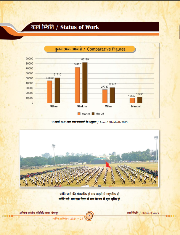 વર્તમાનમાં રાષ્ટ્રીય સ્વયંસેવક સંઘ (RSS) ની કુલ 83129 દૈનિક શાખાઓ છે. ગયા વર્ષથી અત્યાર સુધીમાં 10,000 શાખાઓનો વધારો થયો છે. સાપ્તાહિક મિલનની સંખ્યા 32147 છે, જેમાં ગયા વર્ષ કરતાં 4430 સાપ્તાહિક મિલનનો વધારો થયો છે. સંઘ મંડળીની સંખ્યા 12,091 છે.